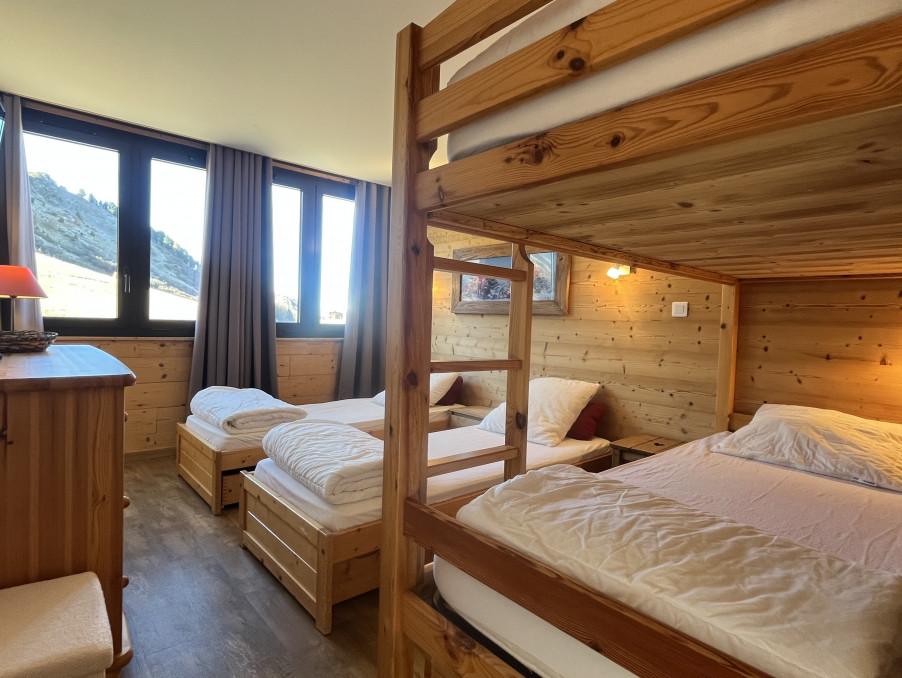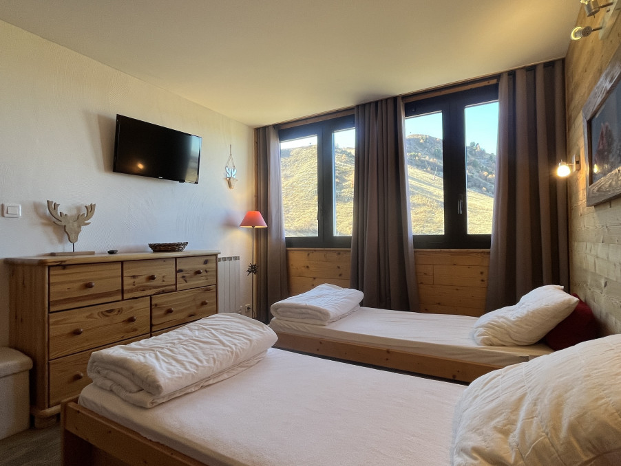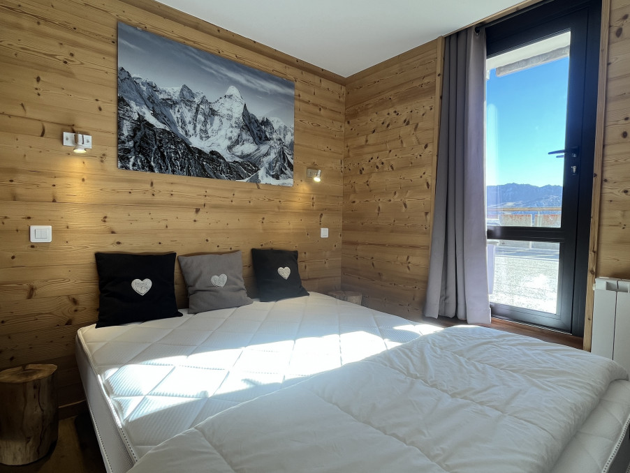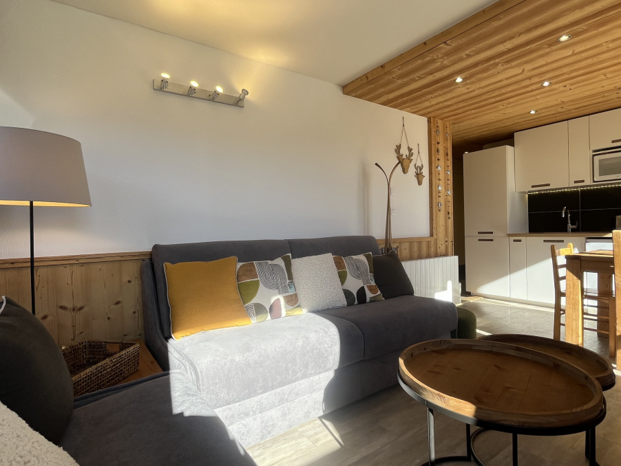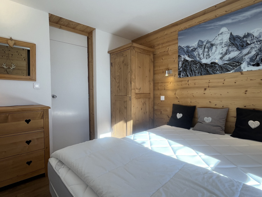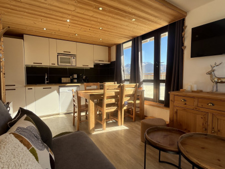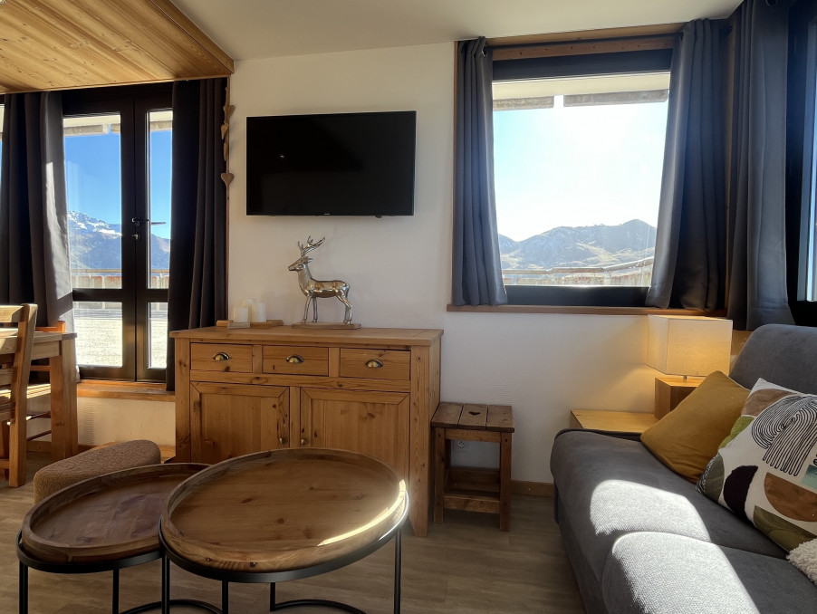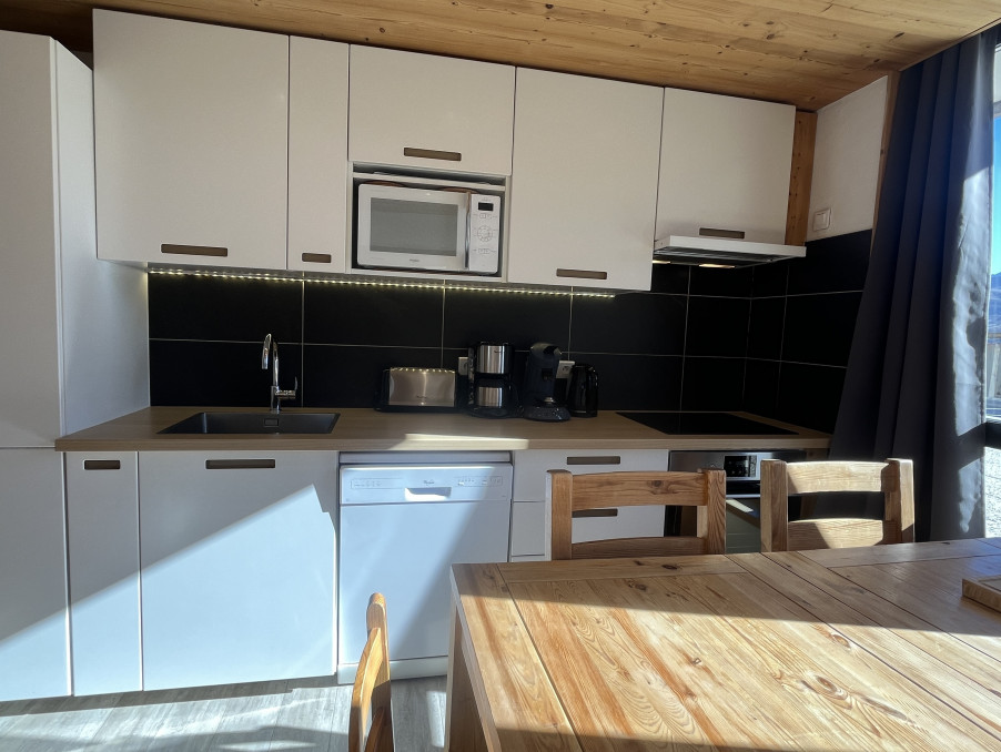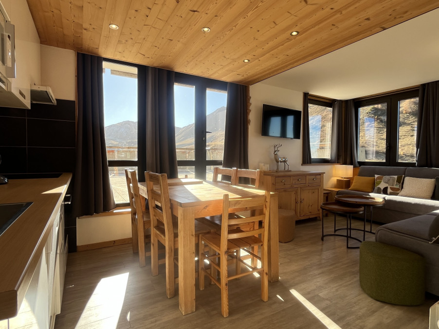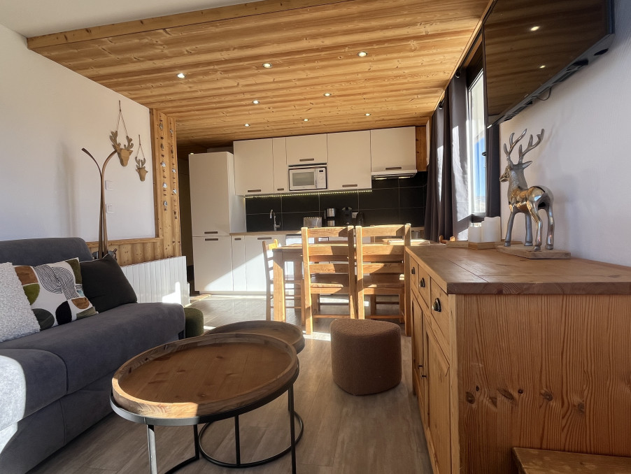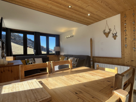 Magnifique 3 pièces entièrement rénové d'environ 52 m² disposant de 2 chambres, un grand séjour avec cuisine américaine et bénéficiant d'une grande terrasse d'angle exposée Sud/Sud/Est avec vue sur les pistes.