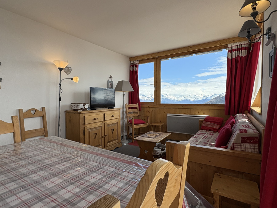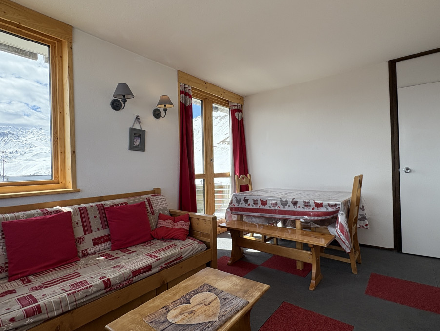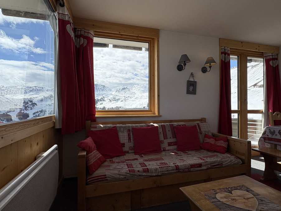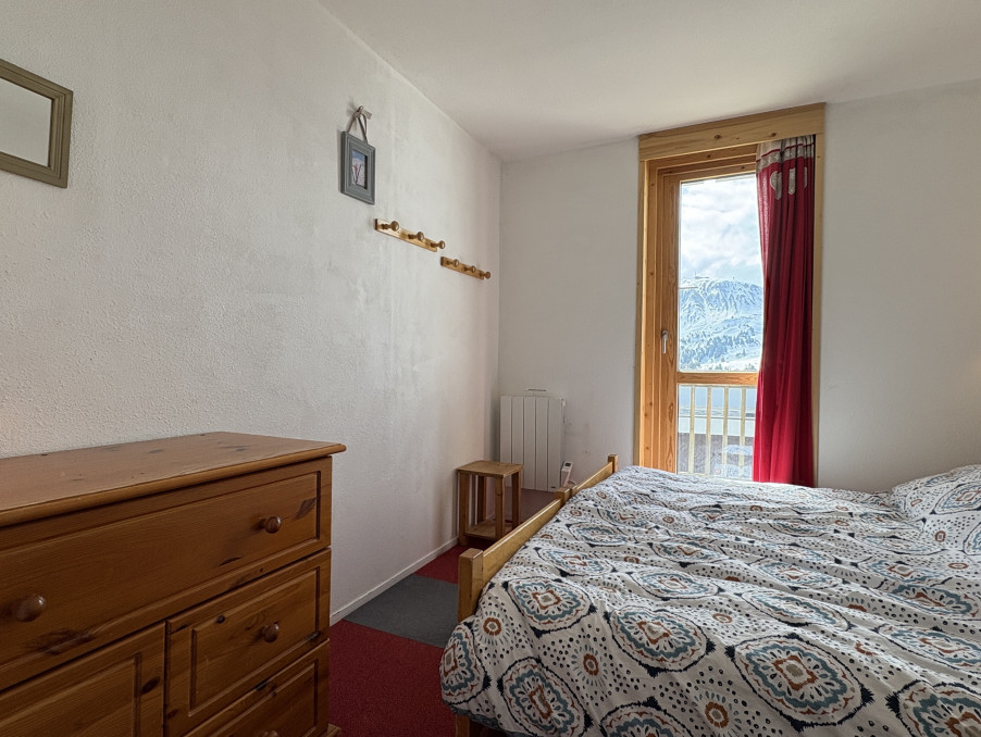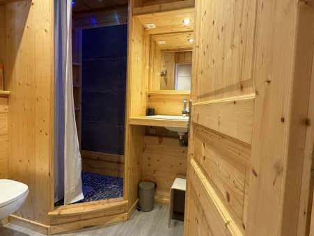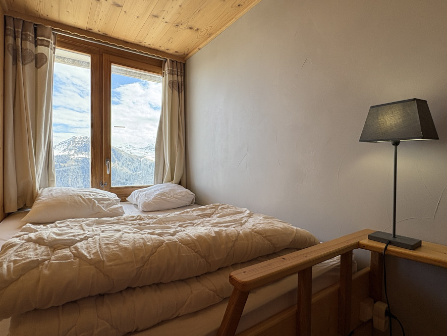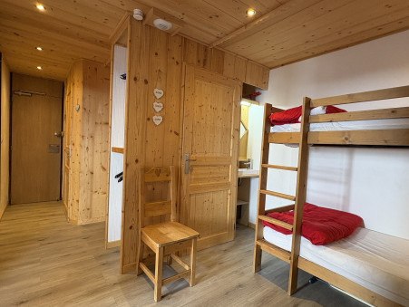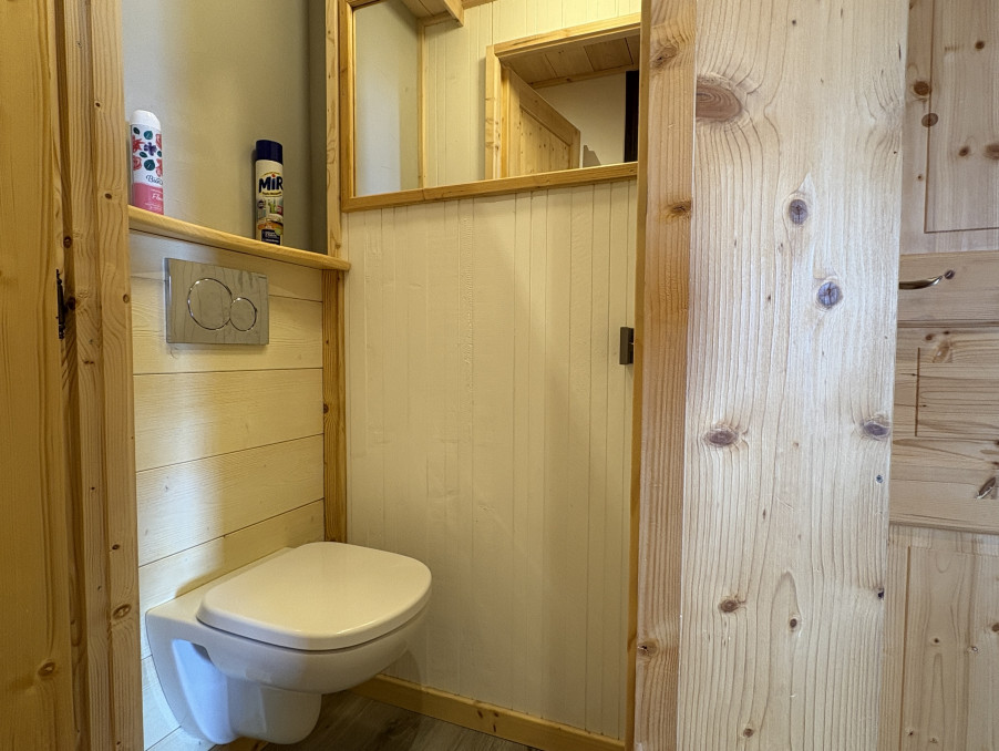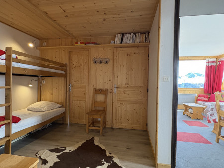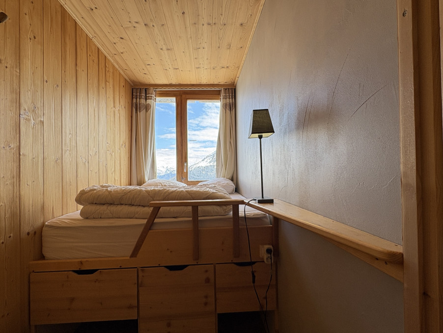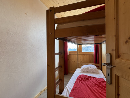 Une chambre double avec balcon, un coin avec 2 lits superposés et un point d'eau, une chambre avec 2 lits superposés, une chambre avec lit double, un WC séparé, une salle de bains avec douche, une cuisine équipée, un séjour avec un canapé lit gigogne