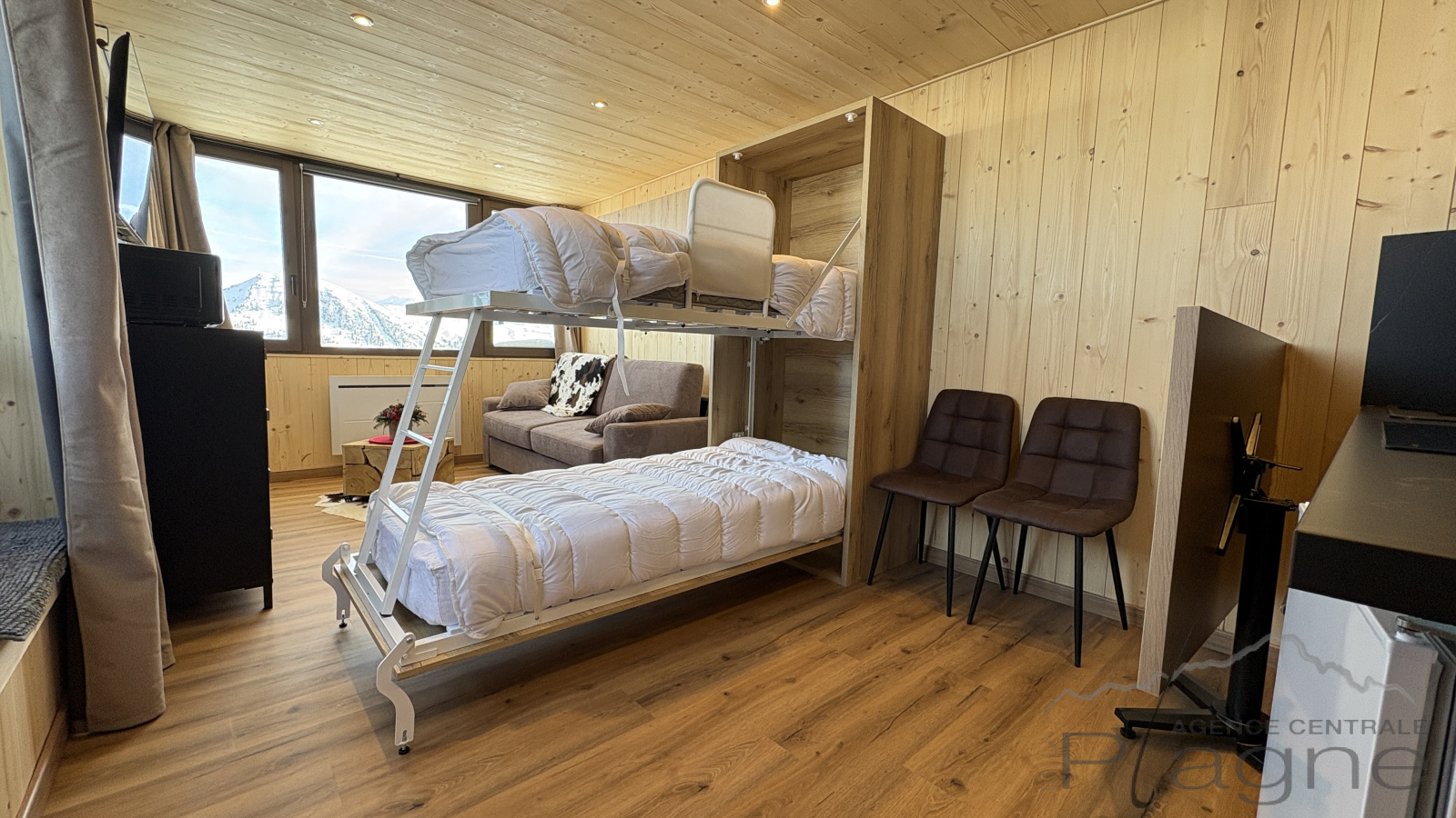 Séjour : 1 Canapé lit 2 pers 160 (couettes) + 2 lits superposés rabattables