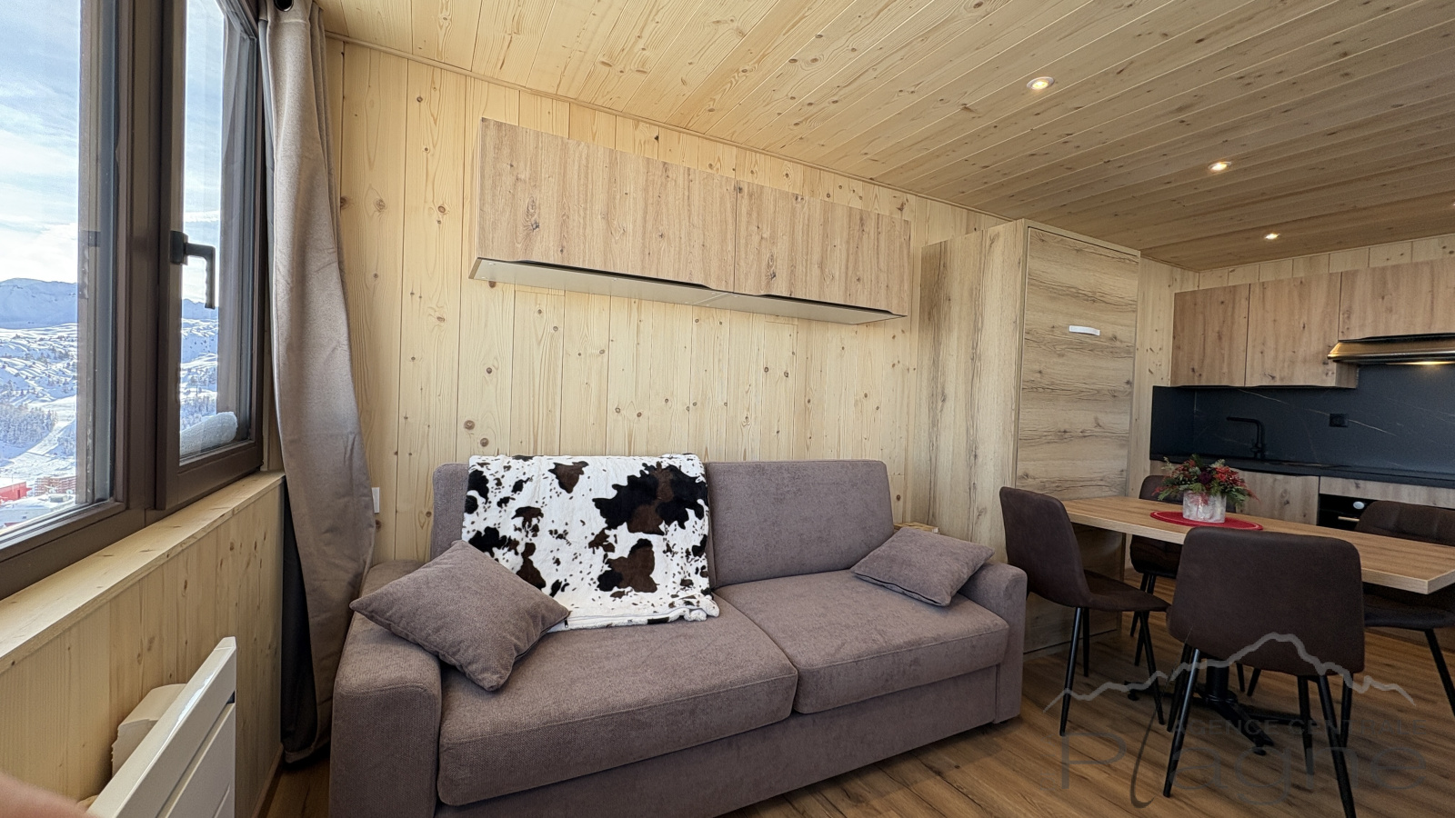 Il est situé dans la station d'AIME 2000 - FLECHE , la plus haute (2100 m) et peut-être la plus originale de La Plagne avec sa Résidence du même nom.Immeuble situé au pied des pistes avec un départ direct vers 4 directions et stations différentes qui bénéficie d'une Galerie Commerciale intérieure avec tous ses commerces, loisirs et services à bord et qui est également reliée à la station de Plagne Centre par le Télémétro (6mns).