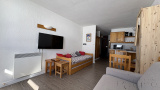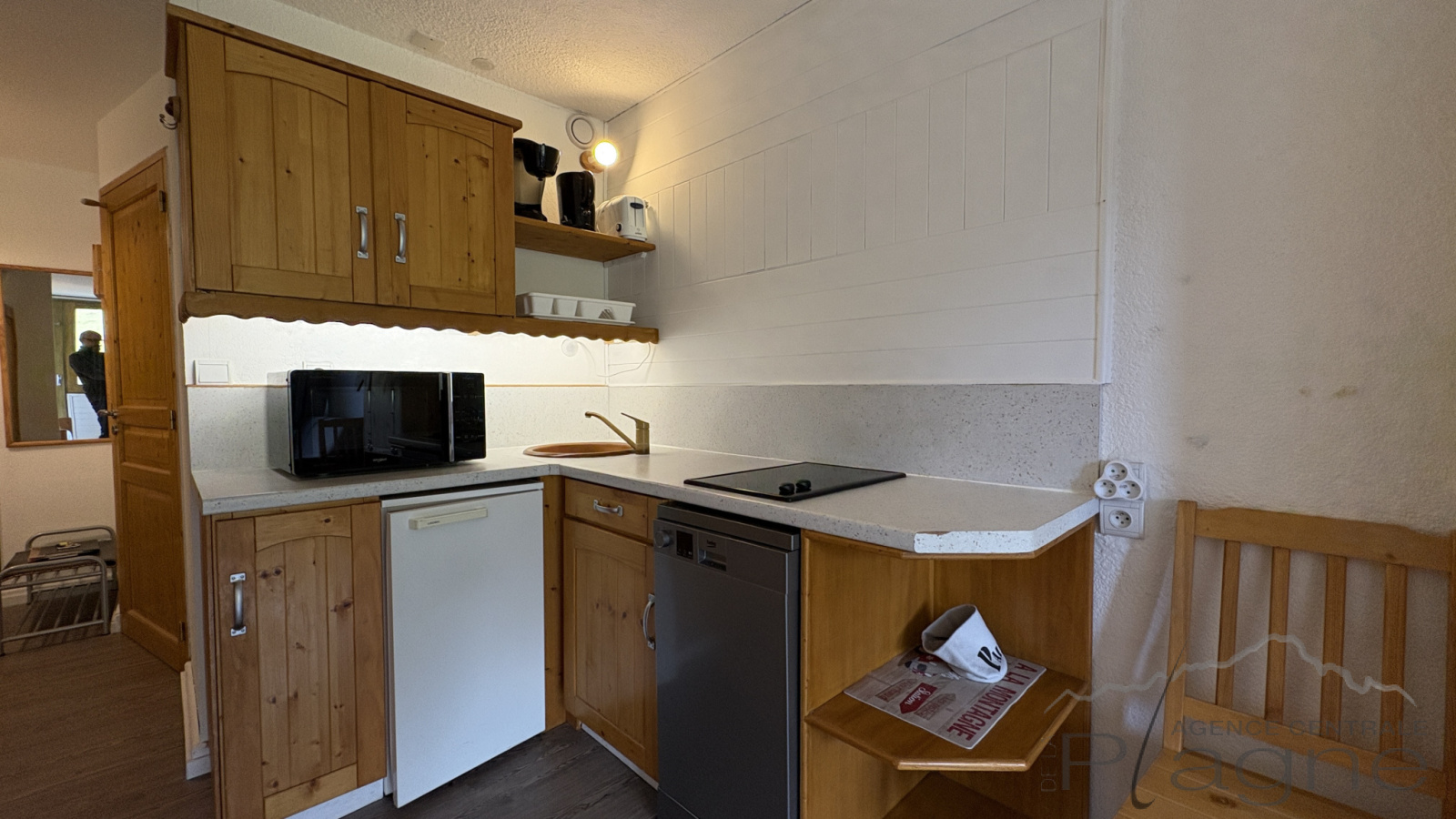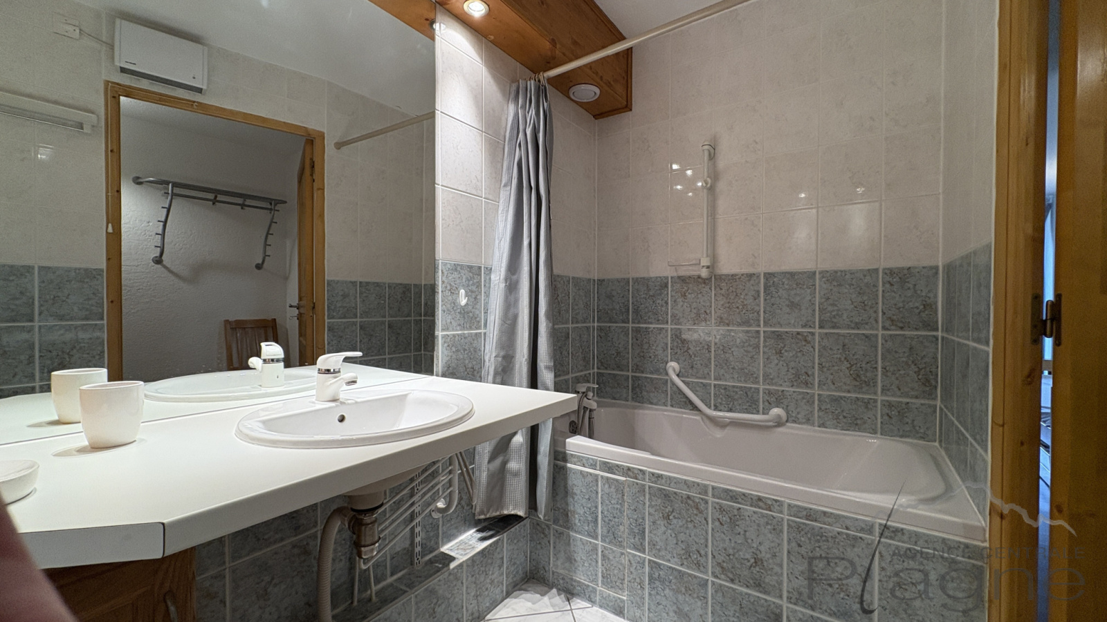 Studio environ 26m² pour 4 personnes - EQUIPE PERSONNES A MOBILITE REDUITE. Une grande entrée, une grande SDB avec poignée WC, Baignoire avec poignée, cuisine ouverte sur séjour.