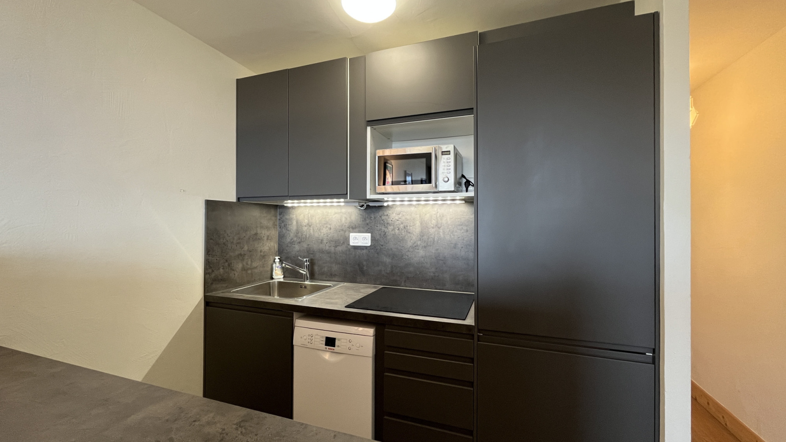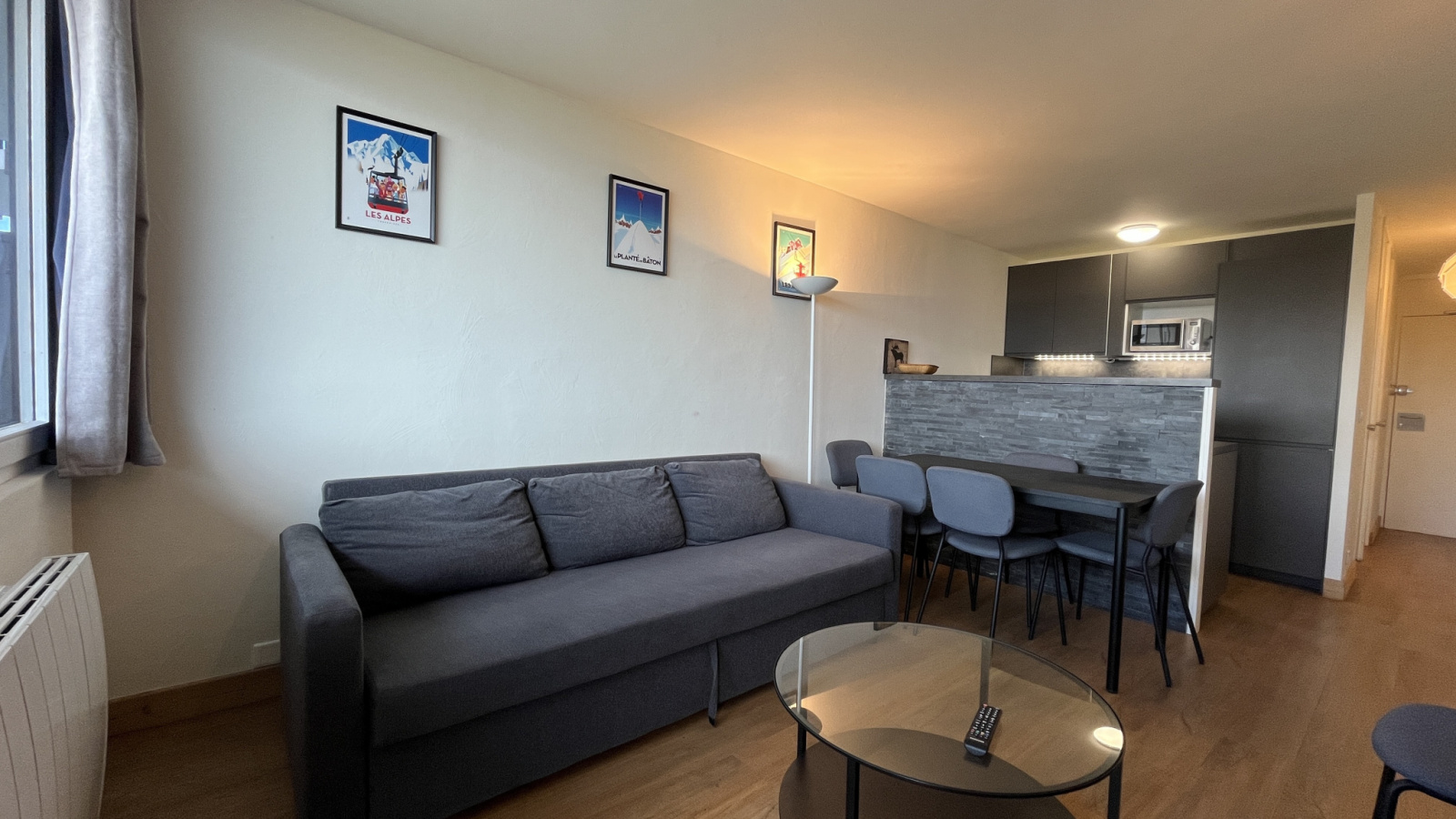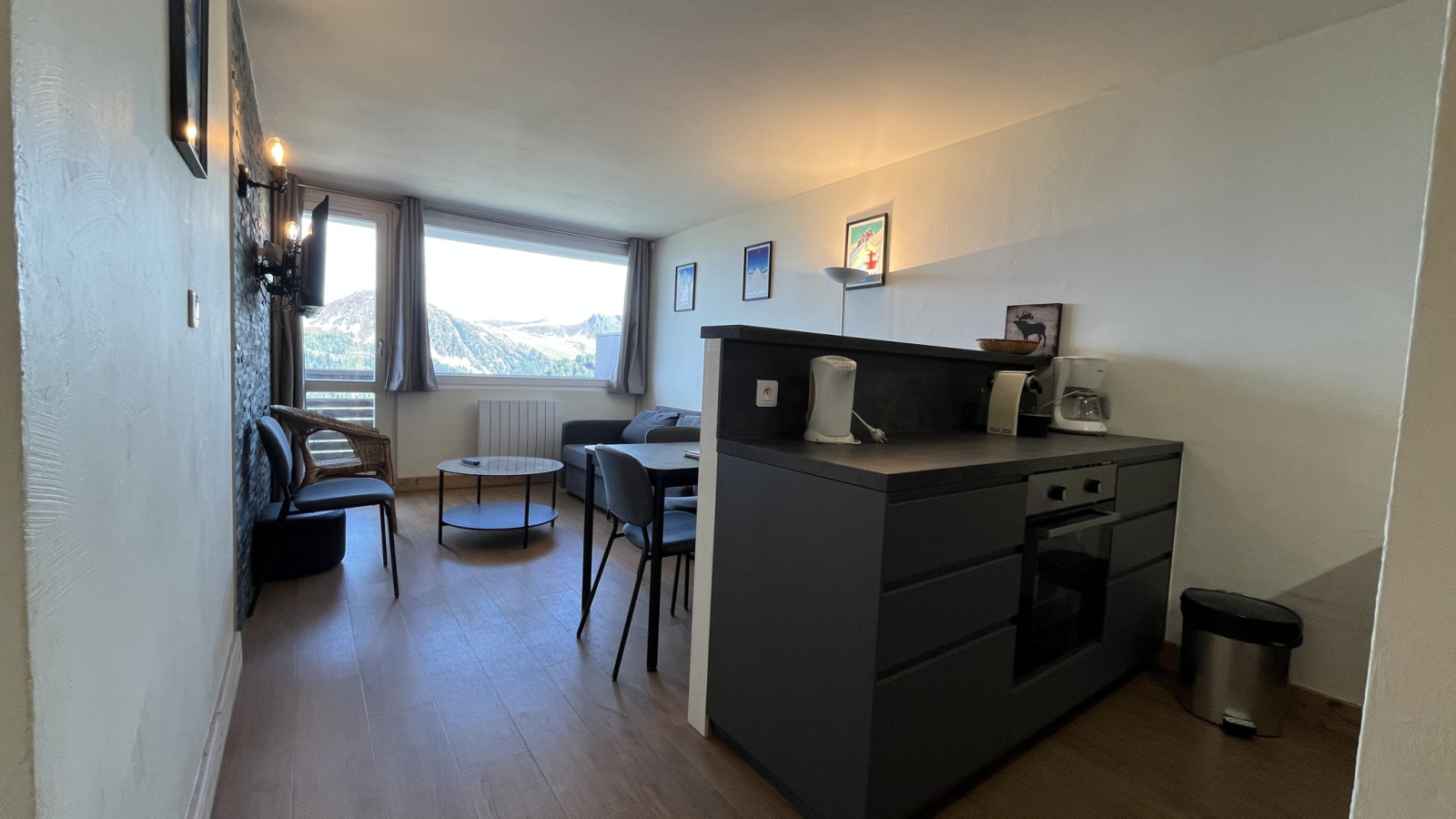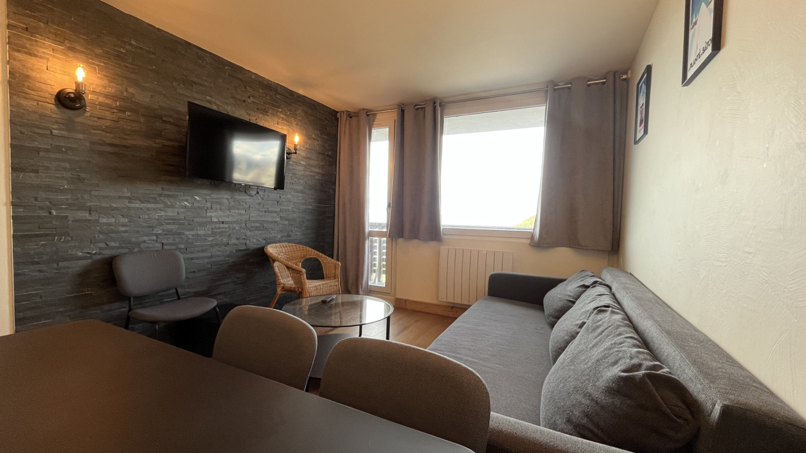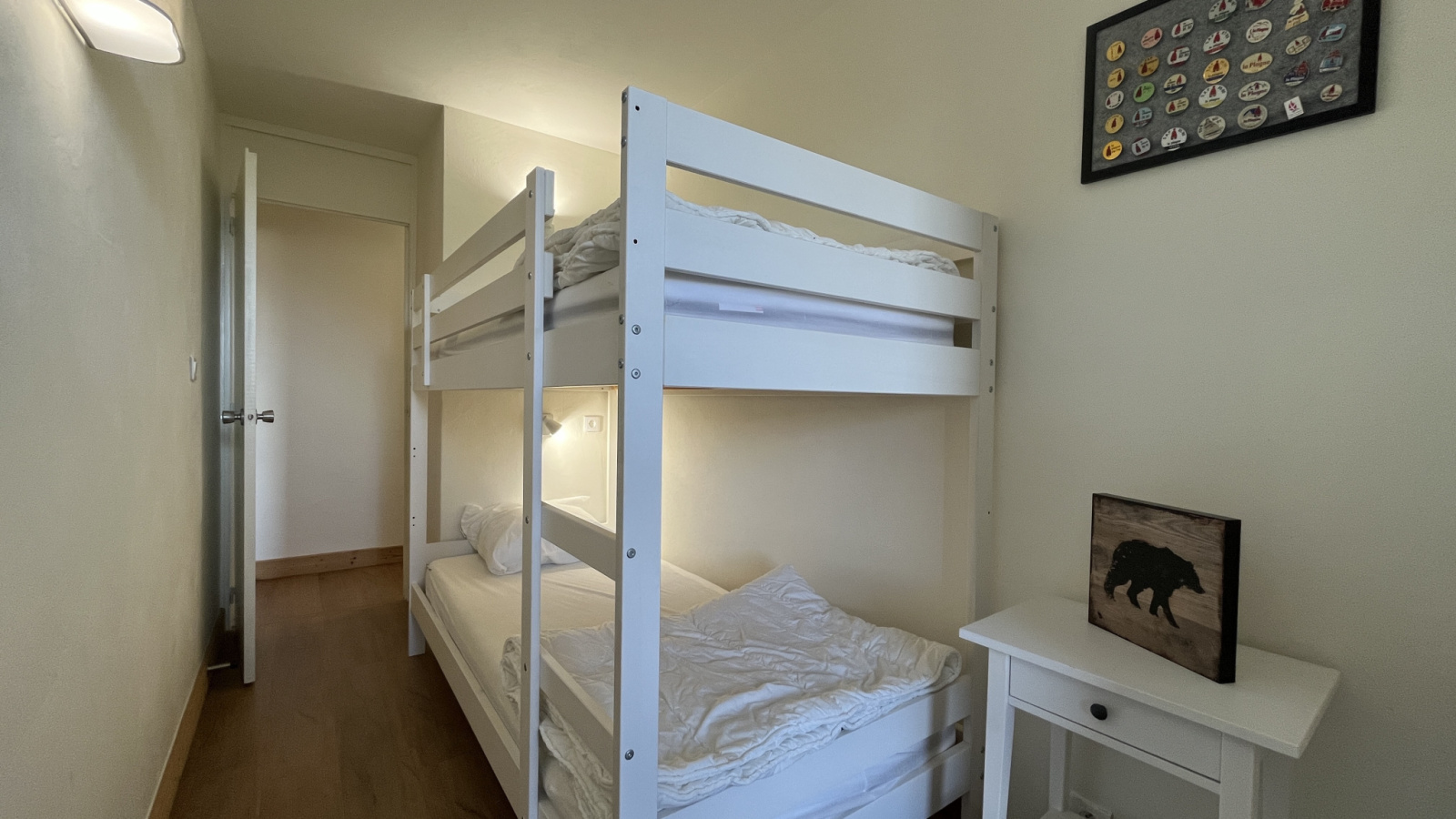 Bel Appartement 3 Pièces de 45M² entièrement rénové pour 6 personnes bénéficiant d'une chambre double, une chambre avec 2 lits superposés , une cuisine équipée ouverte sur séjour, une salle de bains avec WC . Un grand balcon avec vue sur le Mont-Blanc