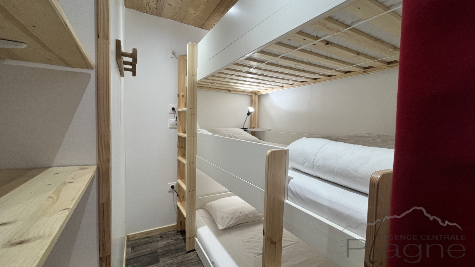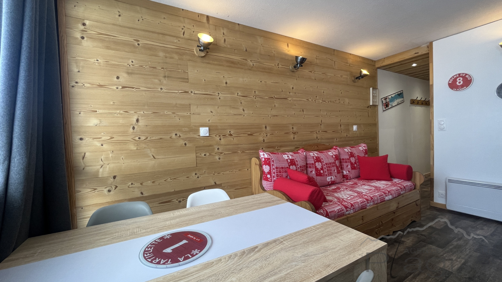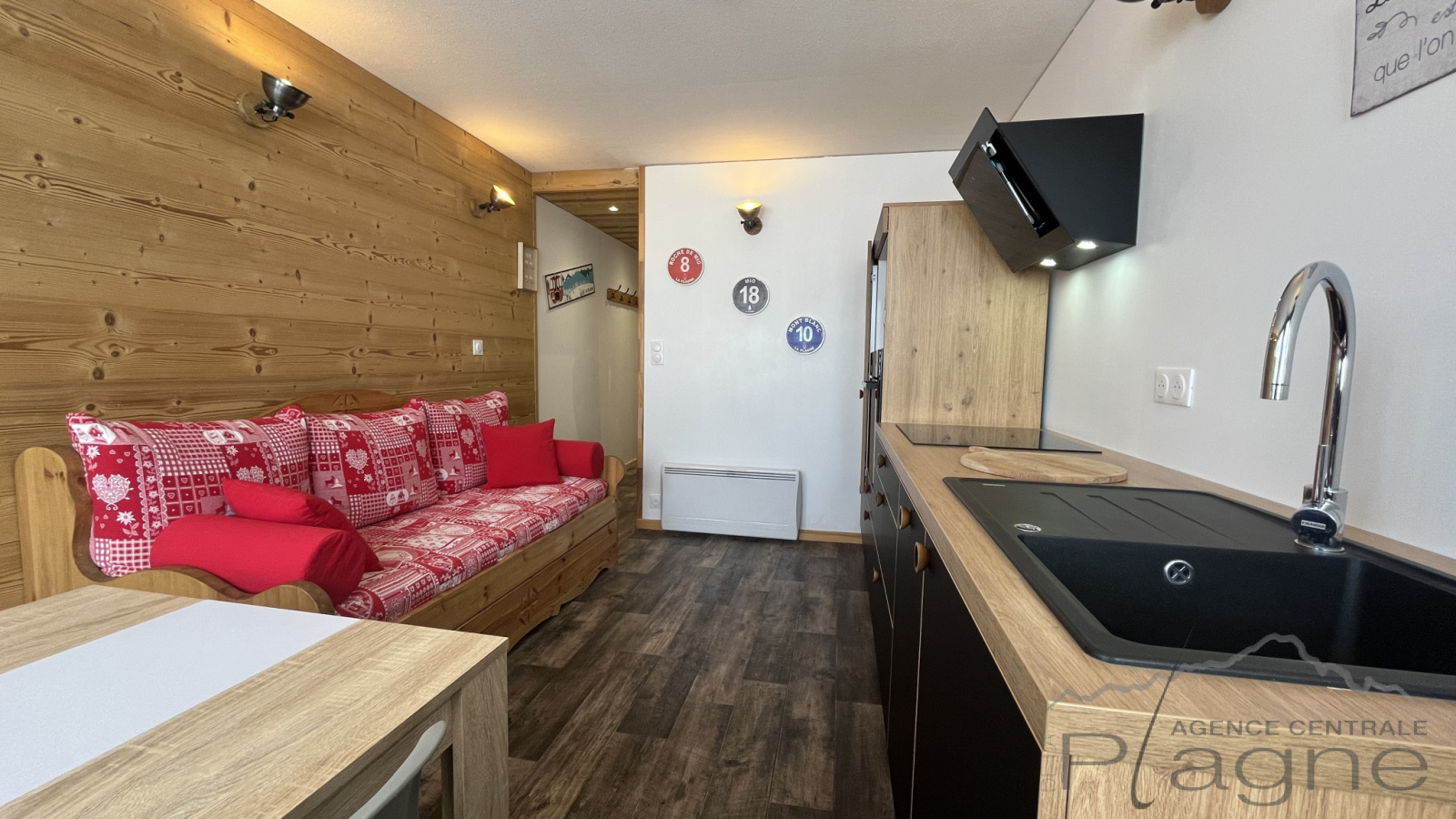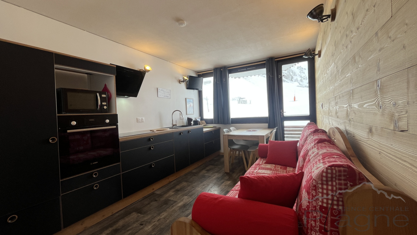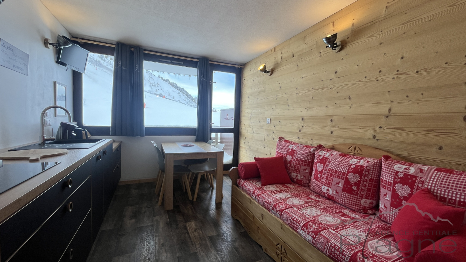 Ce très joli studio d'environ 26 m² entièrement rénové bénéficie d'un WC séparé, une salle de bains, un coin nuit, une cuisine équipée ouverte sur séjour et d'un balcon exposé Sud/Ouest avec vue sur les pistes.