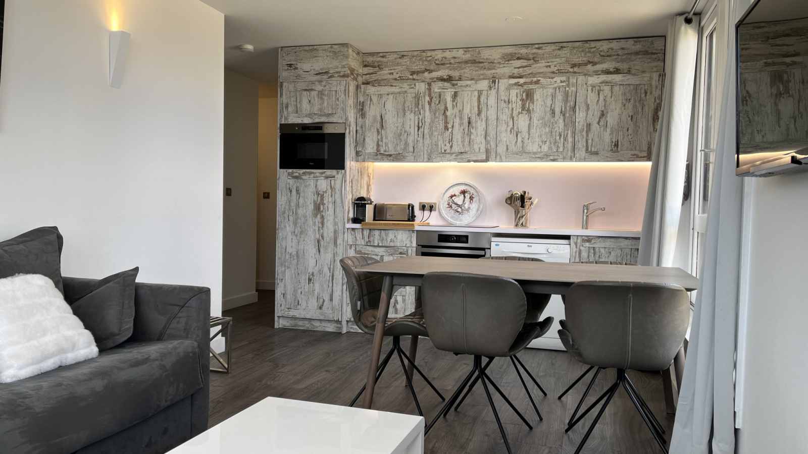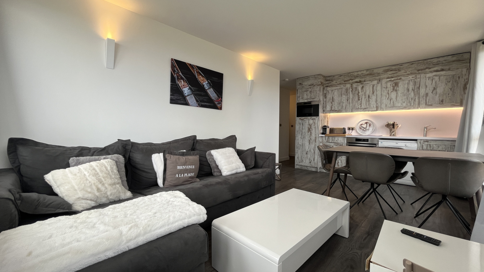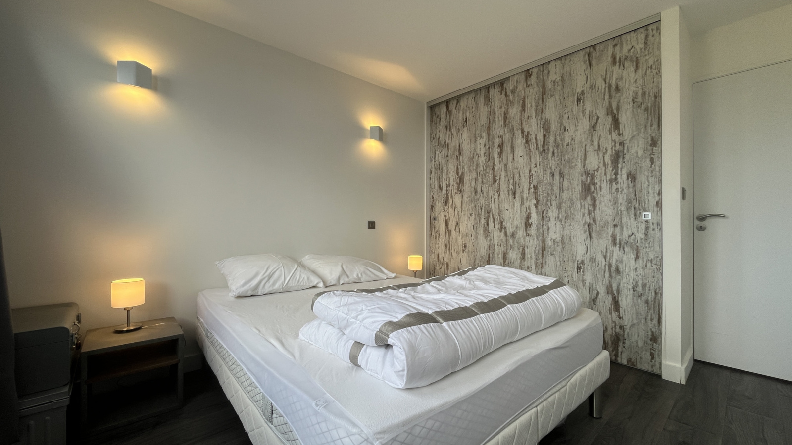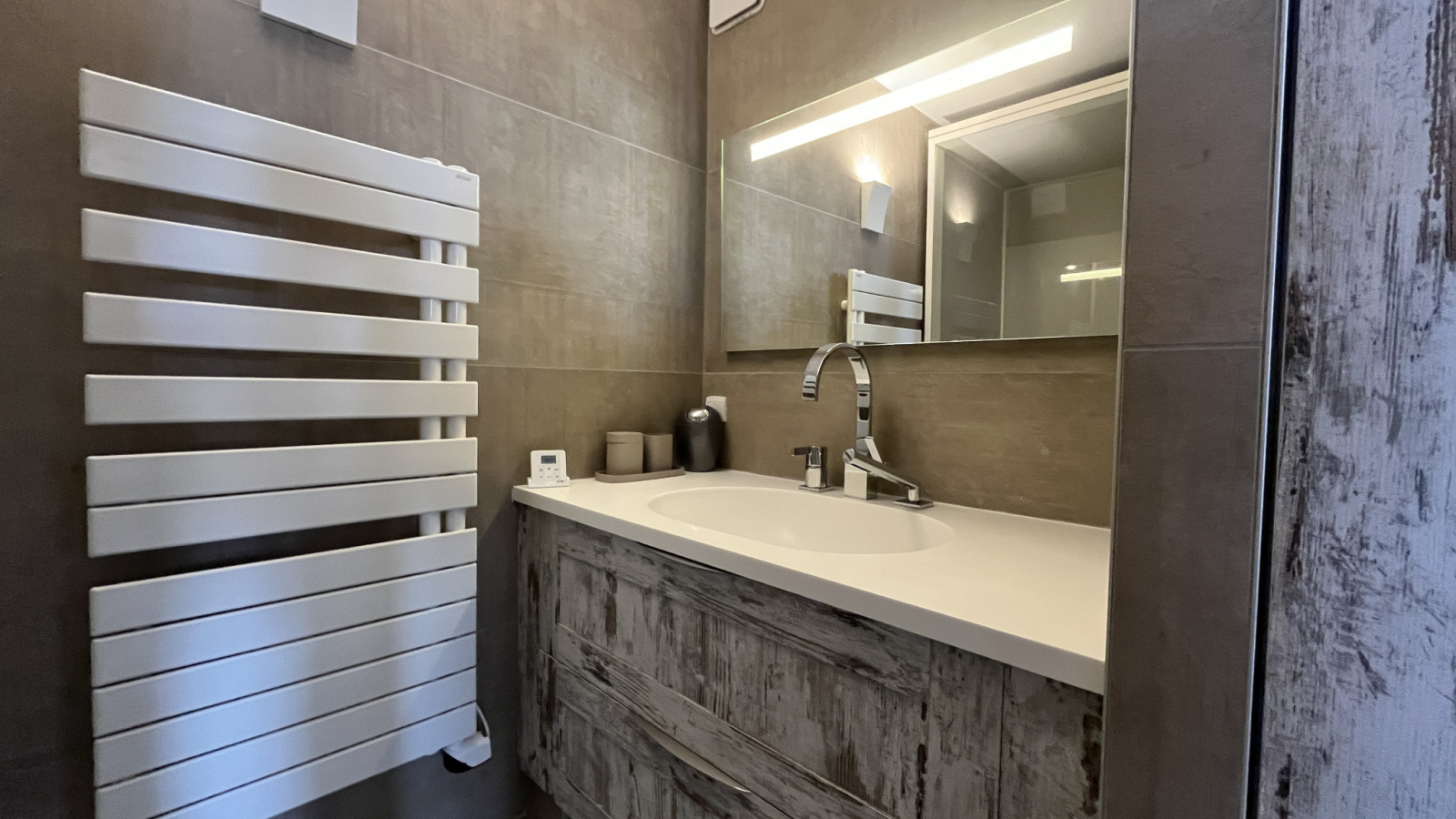 Très bel appartement 3 pièces avec grande terrasse, magnifique vue Mont-Blanc. Bénéficiant de 2 grandes chambres doubles, une salle de bains avec douche et HAMMAM, de nombreux placards, une très belle cuisine ouverte sur le séjour.