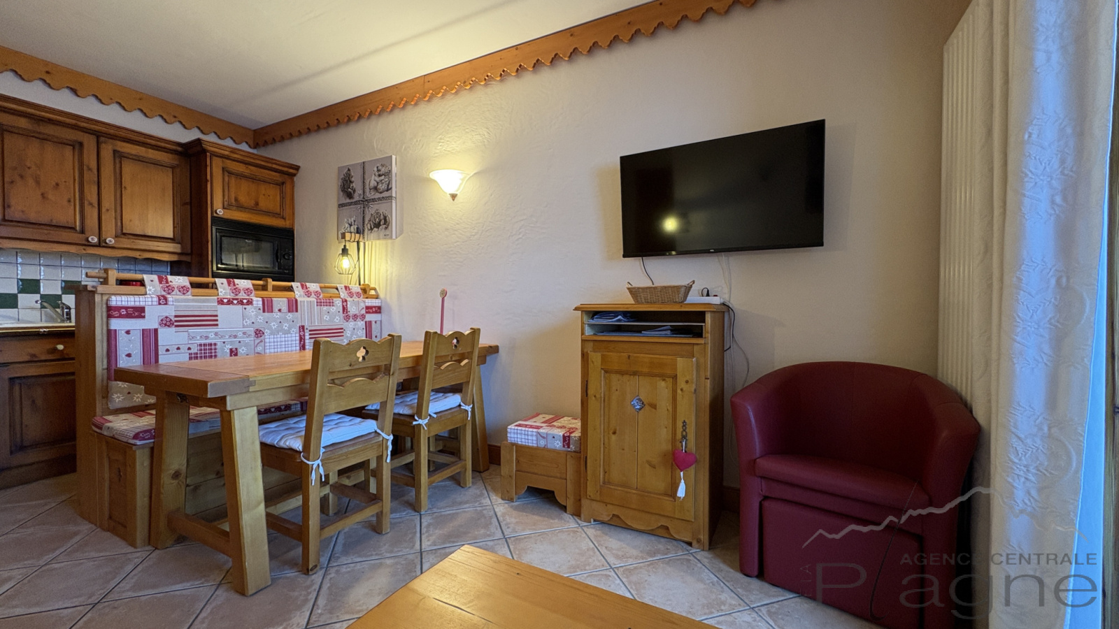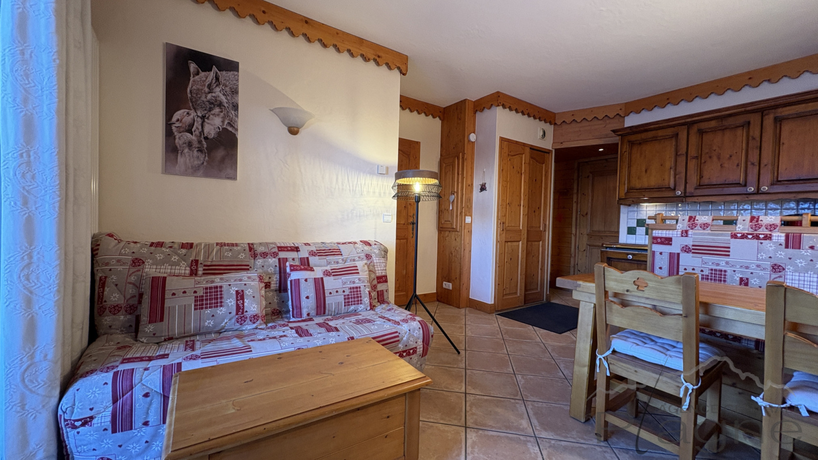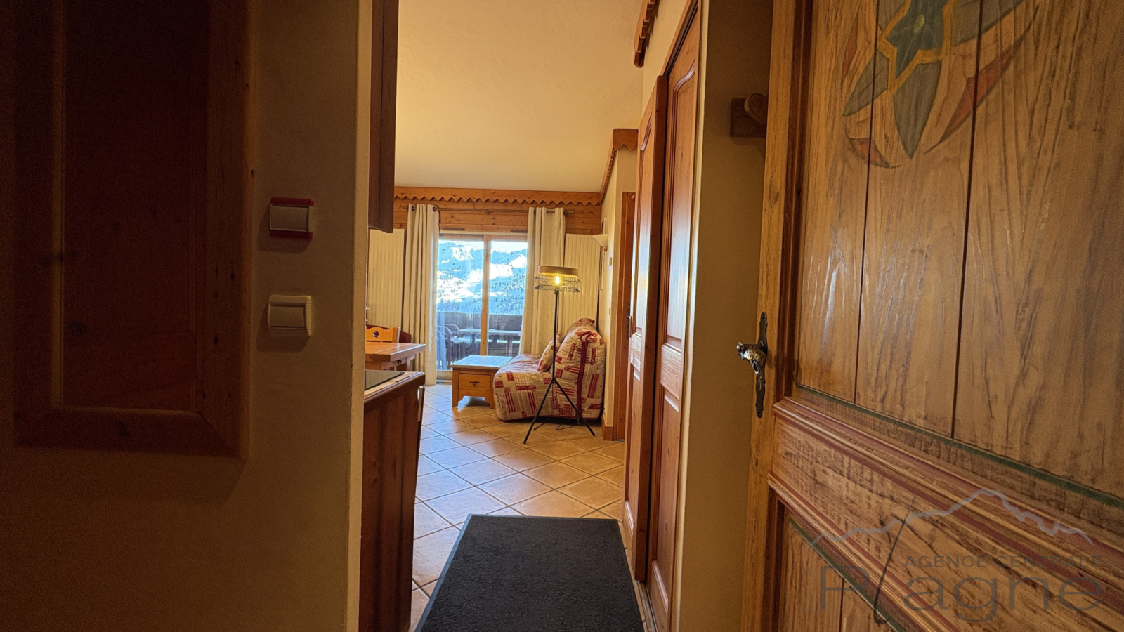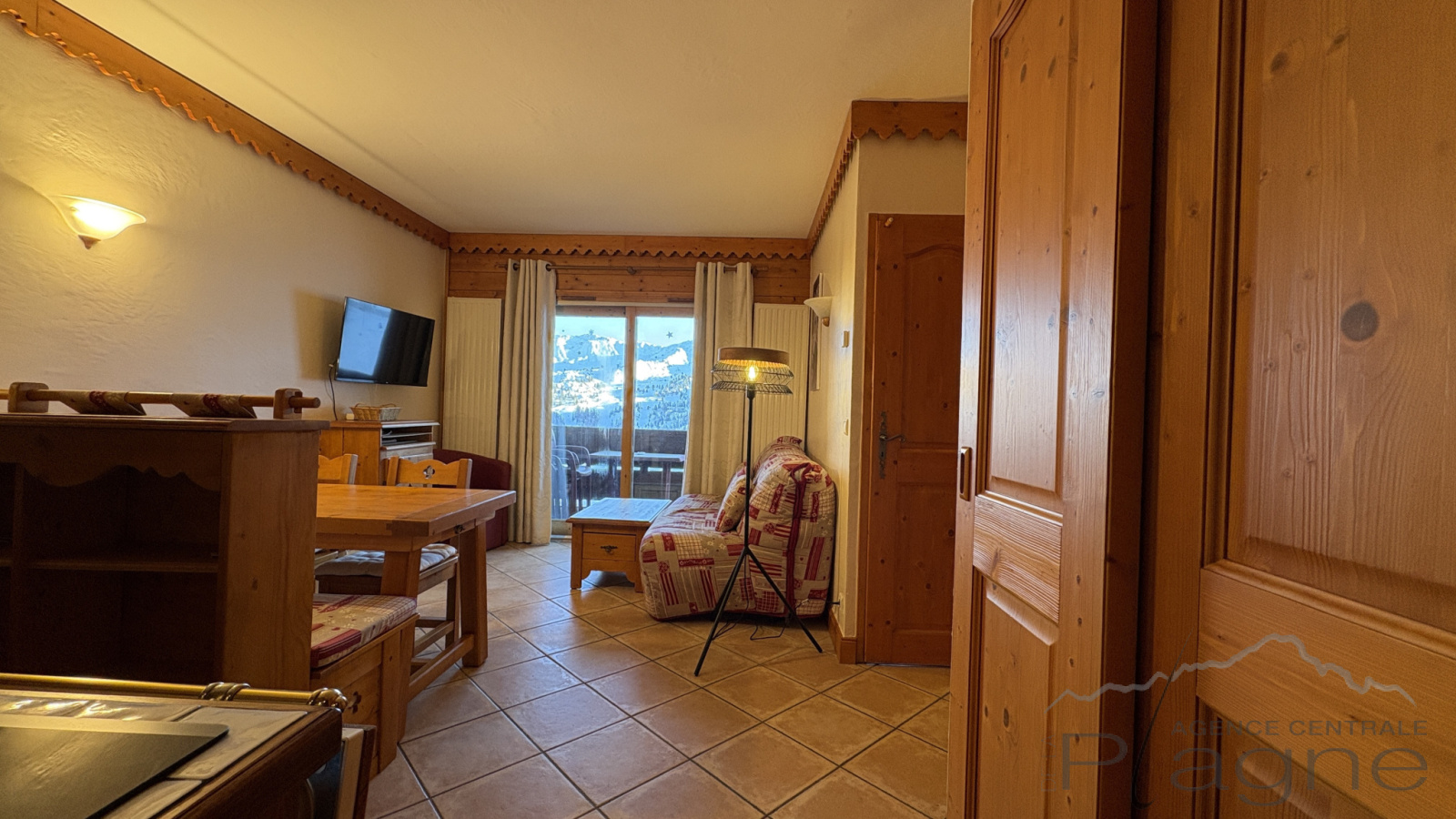 Appartement 2 pièces cabine 6 personnes dans Résidence de prestige avec accès Piscine et SPA. Il dispose d'une terrasse vue sur les pistes et le Mont-Blanc. Vous bénéficiez également d'une place de parking couvert
