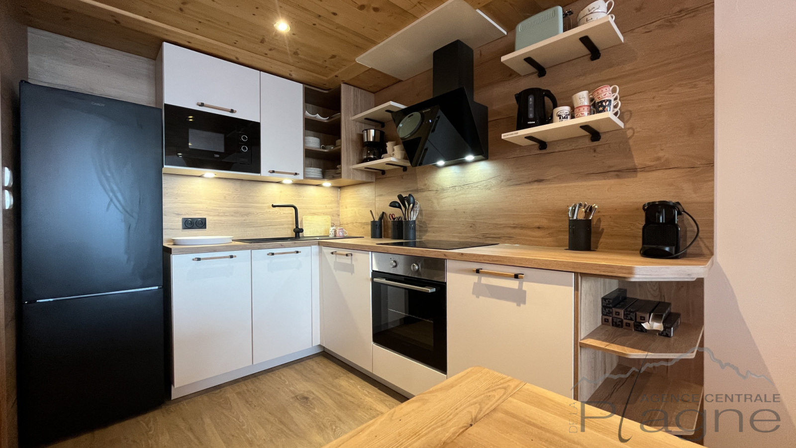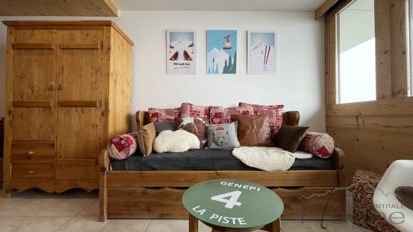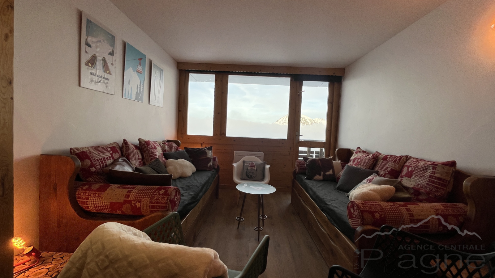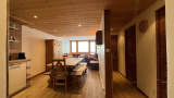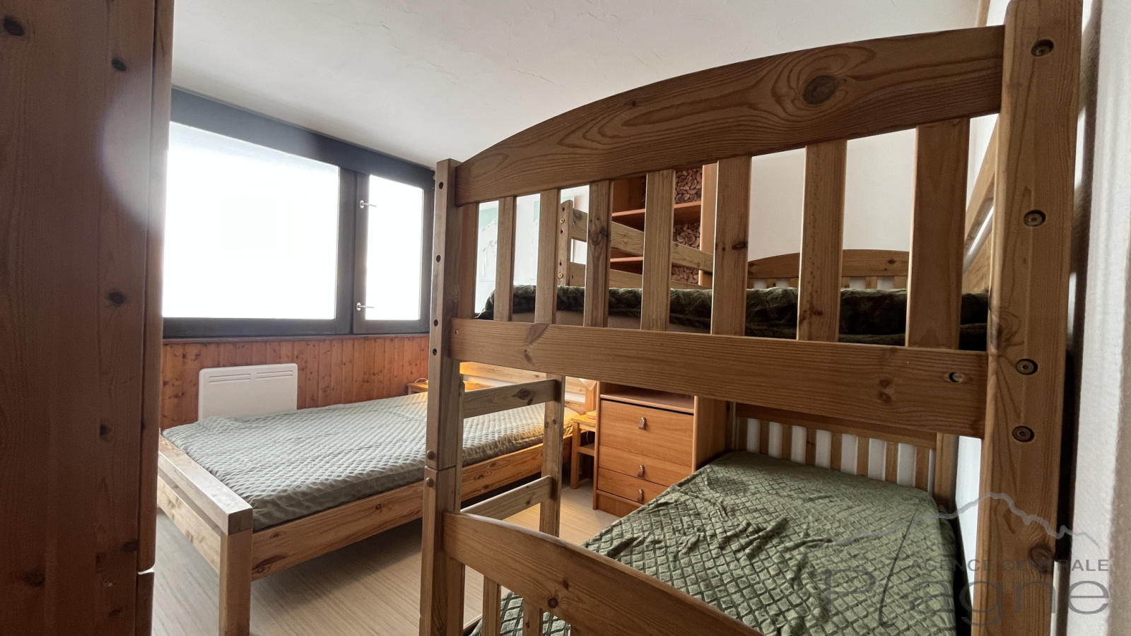 Bel appartement 3 Pièces pour 8 personnes bénéficiant d'une chambre double, une chambre cabine avec 2 lits superposés , une cuisine équipée ouverte sur séjour, une salle de bains, WC séparés . Un grand balcon avec vue sur le Mont-Blanc, exposition Nord/Est