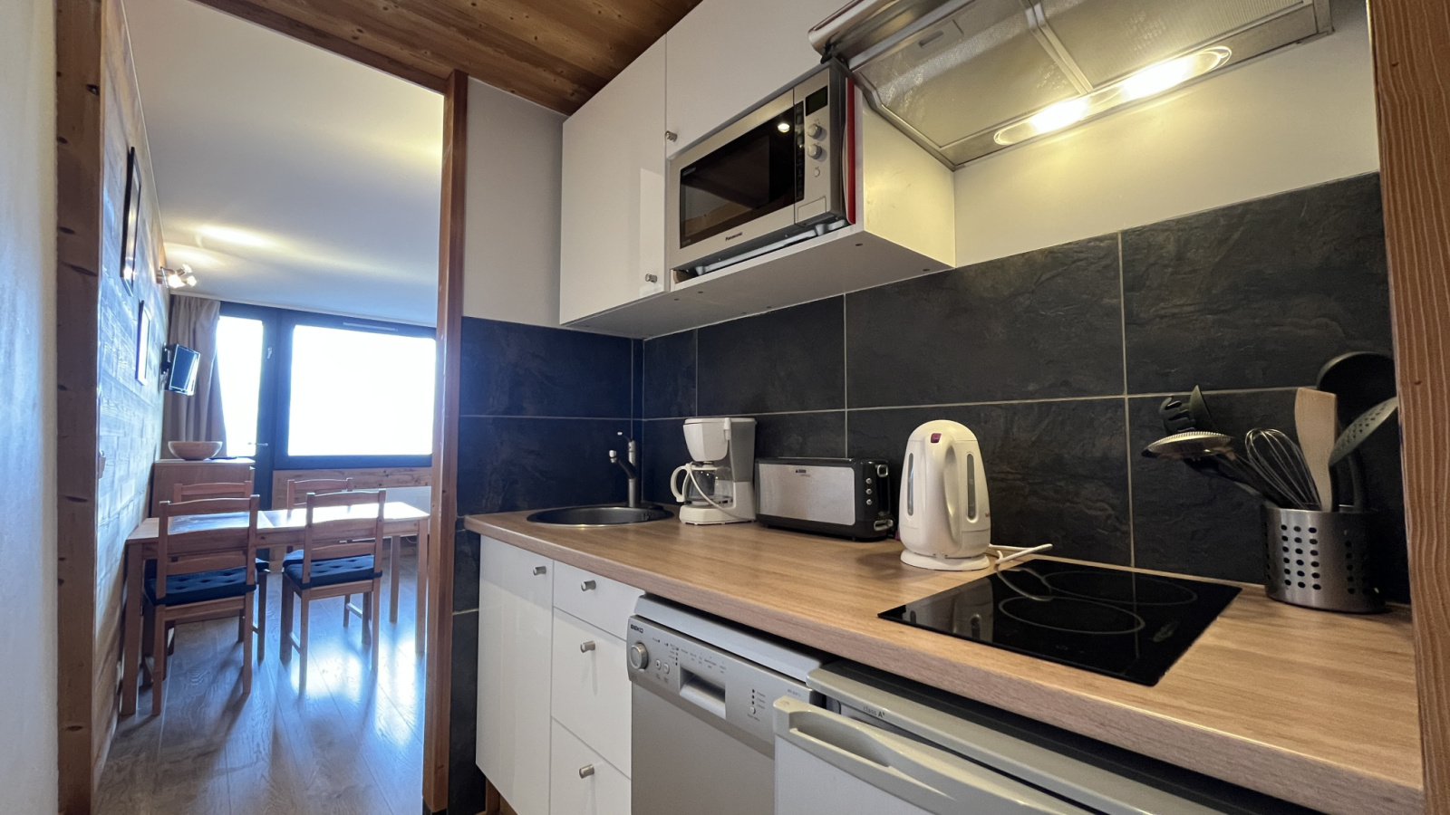 Cuisine : 2 Plaques vitro, 1 micro ondes (mixte), 1 LV, cafetière électrique